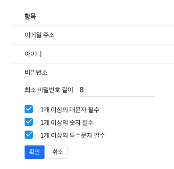 비밀번호: 비밀번호 사용은 필수입니다. 정책 수정 버튼을 클릭해 비밀번호 입력 방식을 변경할 수도 있습니다.