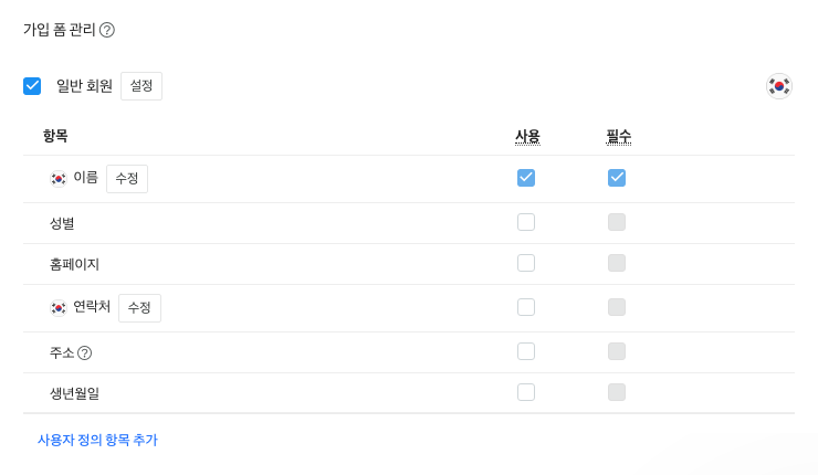 회원가입 페이지에서 작성해야 할 항목(들)을 설정합니다. 이곳에서 사용으로 선택한 항목들은 회원이 가입을 시도할 때 가입 정보 입력창에 나타납니다.