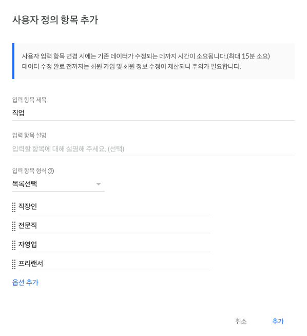 가입 폼에 필요한 항목을 사용자가 직접 추가할 수 있습니다. 예를 들어, 가입 항목에 '직업'이 필요한 경우, 새롭게 항목을 추가할 수 있습니다.