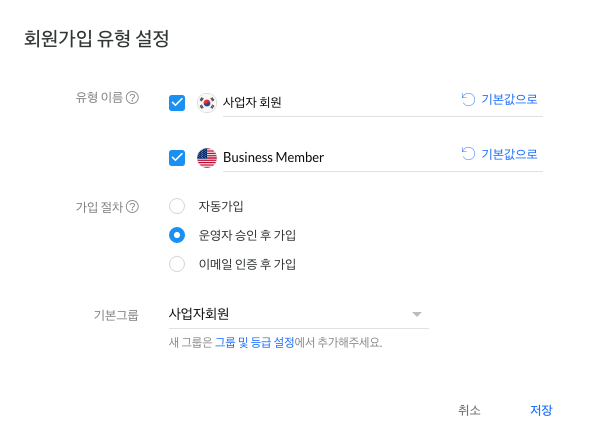 참고: 다국어 사이트를 보유하고 있는 경우 언어별로 가입자 유형을 설정할 수 있습니다. 예를 들어 국문과 영문 사이트 2개를 보유하고 있는 경우 위 그림처럼 사용여부 및 유형 이름을 해당 언어에 맞게 설정 가능합니다.