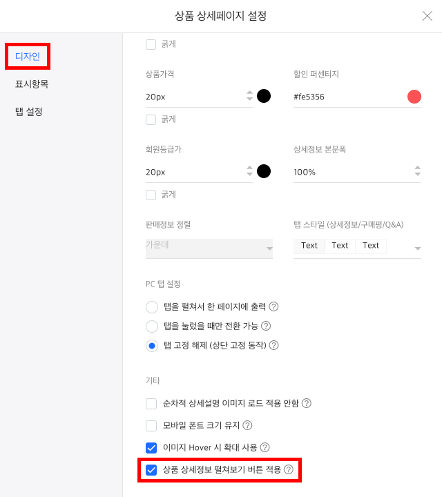 디자인 탭 메뉴 최하단의 기타 항목에서 상품 상세정보 펼쳐보기 버튼 적용 옵션을 선택합니다.