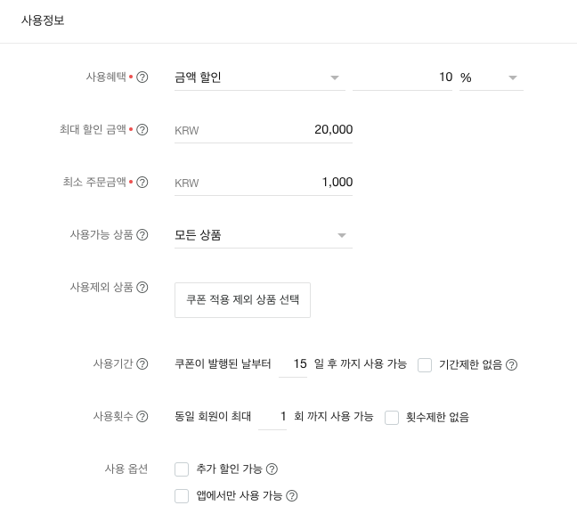 쿠폰정보를 설정합니다. 아래의 그림과 설명을 참고할 수 있습니다.