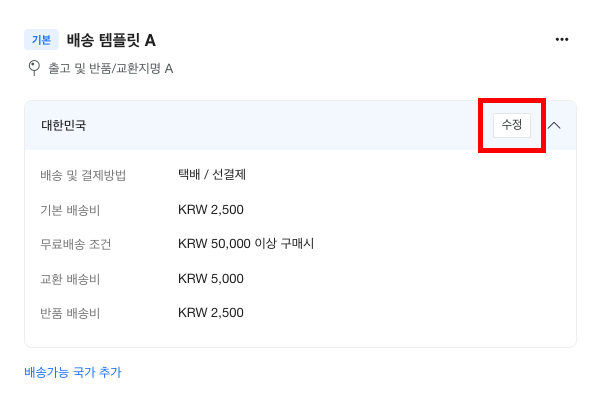 지역별 배송비를 적용할 배송 템플릿에 수정 버튼을 클릭합니다.