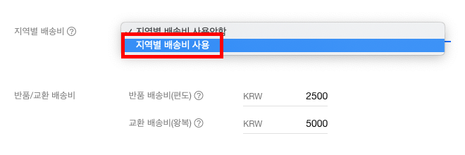 지역별 배송비 항목에서 지역별 배송비 사용을 선택합니다.