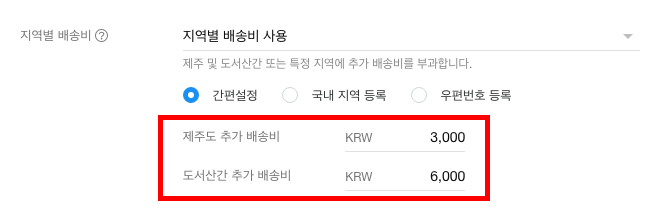 지역별 배송비를 사용하는 경우, 구매자가 도서산간(제주도 포함) 지역으로 배송지를 입력하는 경우, 추가 배송비가 부과하도록 설정할 수 있습니다.