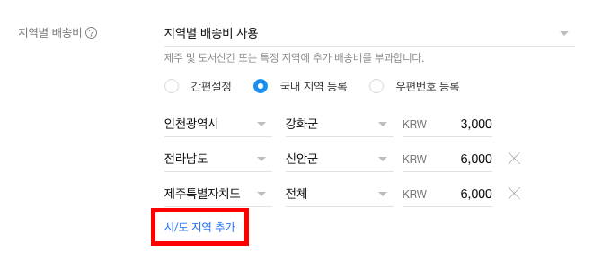 지역을 시/도/군(전체)단위로 설정하고, 추가 배송비를 입력합니다.
