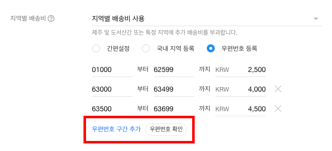 우편번호 구간 추가를 클릭합니다. (여러 개 추가할 수 있습니다.)