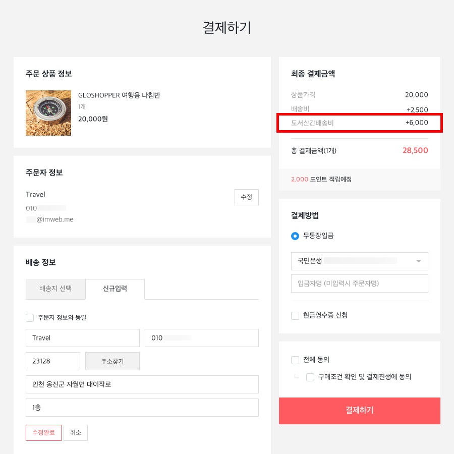 지역별 배송비 상세 설정을 마치면, 테스트 구매를 시도하여 지역별 배송비 설정이 정상적으로 동작하는지 확인합니다.