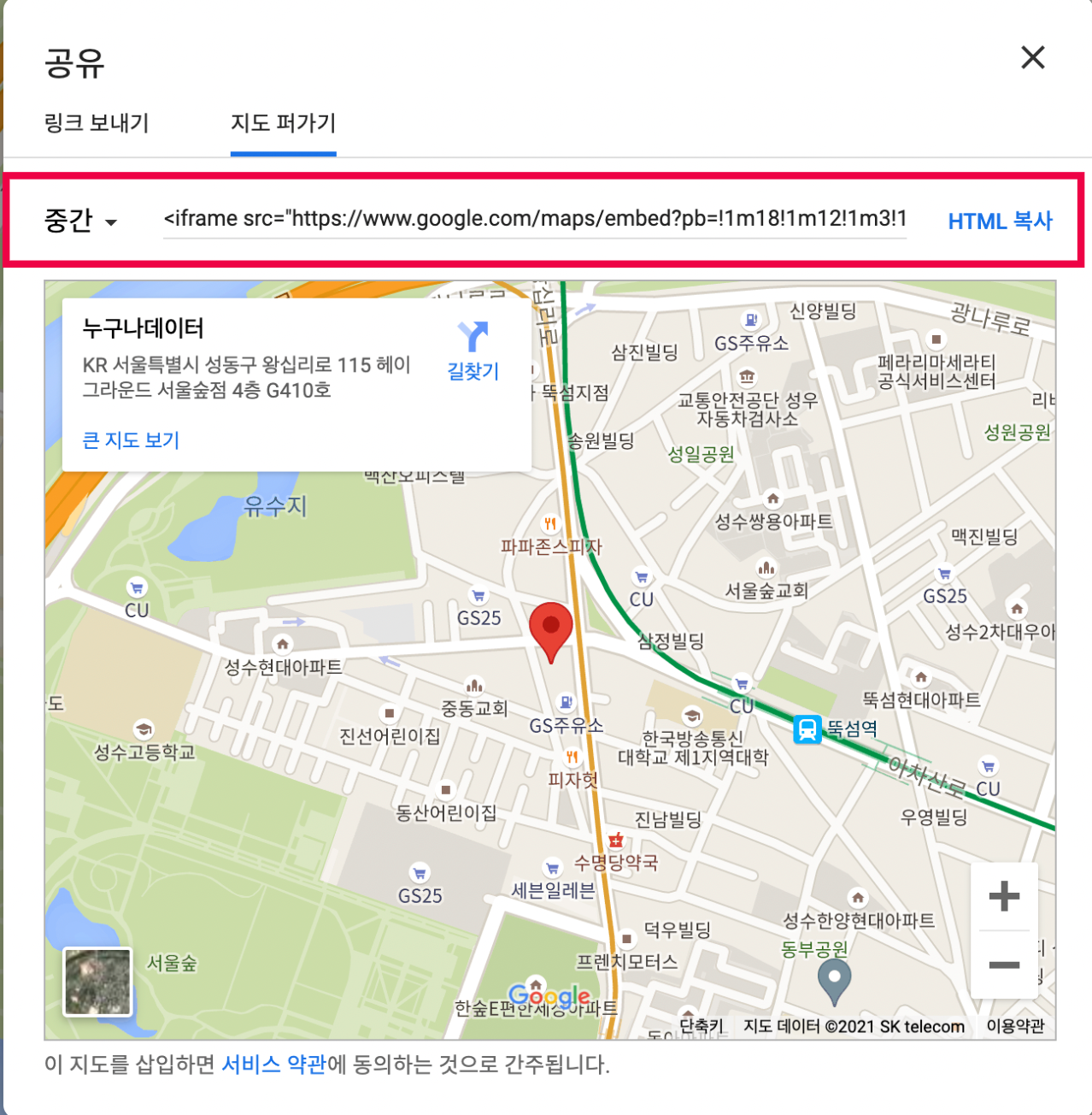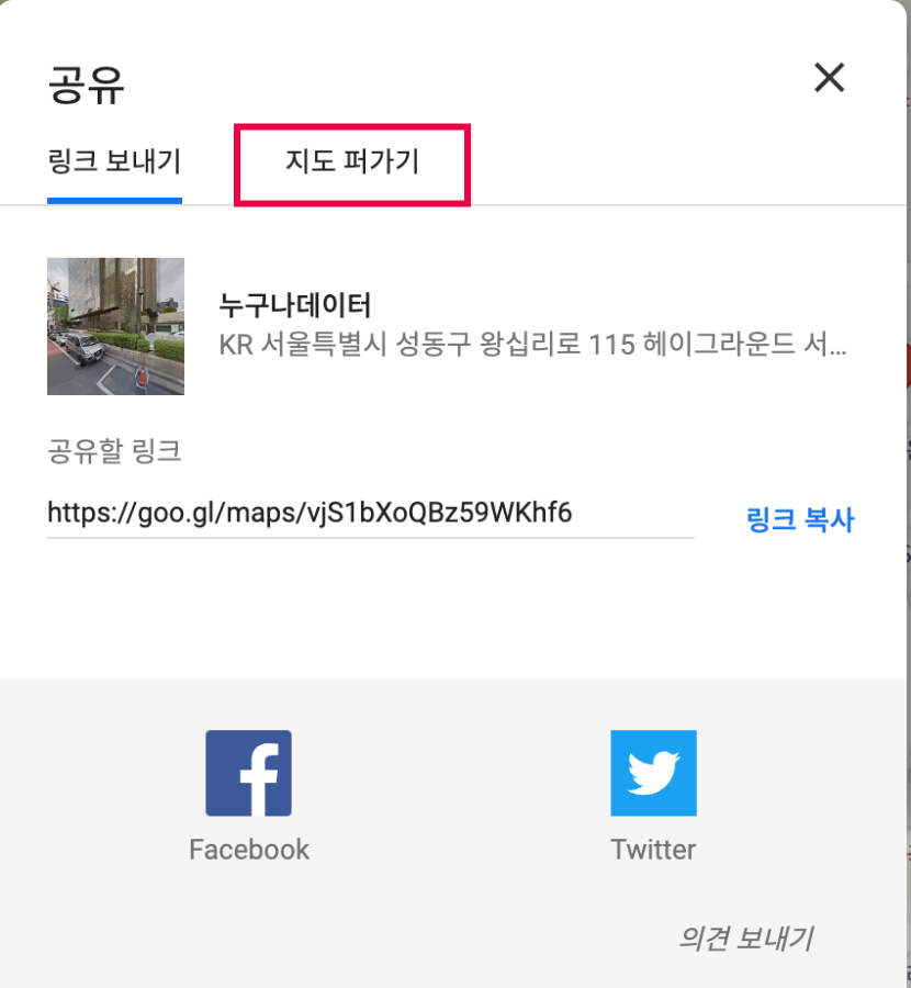 공유 팝업이 나타나면 지도 퍼가기 탭을 클릭합니다.