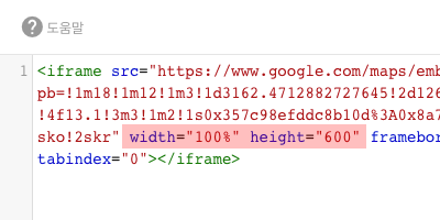 붙여넣기한 코드에서 width(600)와 height(450) 값을 삭제하고, 다음과 같이 수정합니다.