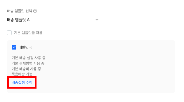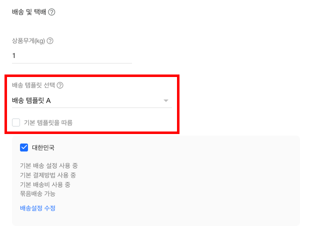 배송 템플릿 선택 항목에서 기본 템플릿을 따름 옵션을 해제하고, 기준으로 할 배송 템플릿을 선택합니다. (특별히 배송 템플릿을 추가하지 않았다면 배송 템플릿 A를 기준으로 배송설정을 수정해도 무방합니다.)