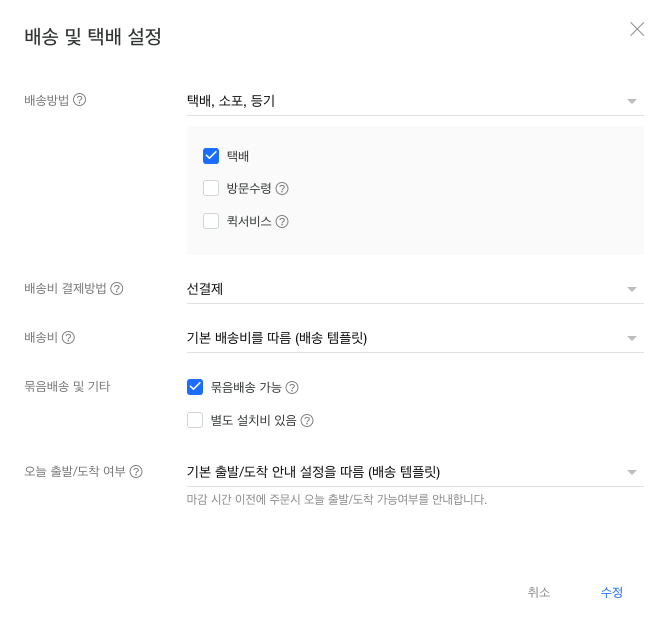 해당 상품을 위한 배송방법, 배송비 결제방법, 배송비, 묶음배송 및 기타, 오늘 출발/도착 여부를 설정합니다.