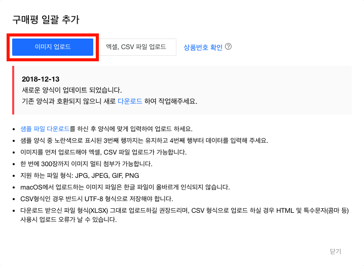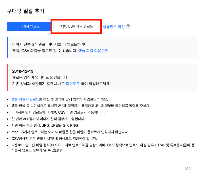 이미지 업로드가 완료되면 오른쪽 엑셀, CSV 파일 업로드 버튼을 클릭합니다.