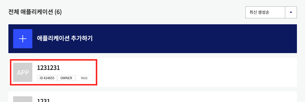 내 애플리케이션 메뉴에 접속하신 후 카카오 소셜 로그인을 설정한 앱을 클릭합니다.