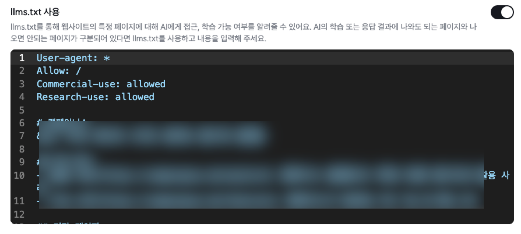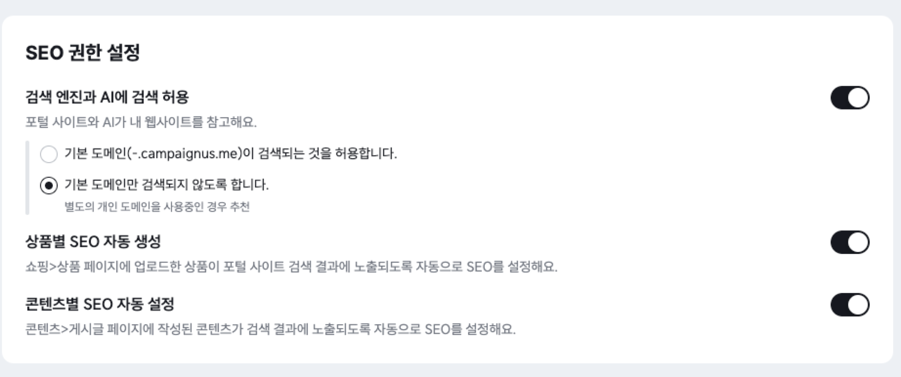 캠페이너스는 기본 SEO 색인 구조와 태그 삽입은 물론, ‘AI 검색 허용’, llms.txt 사용 옵션만 켜두면 GEO까지 자연스럽게 대응할 수 있도록 되어 있어요. 개발자가 없어도, SEO 지식이 없어도 바로 설정이 가능합니다.