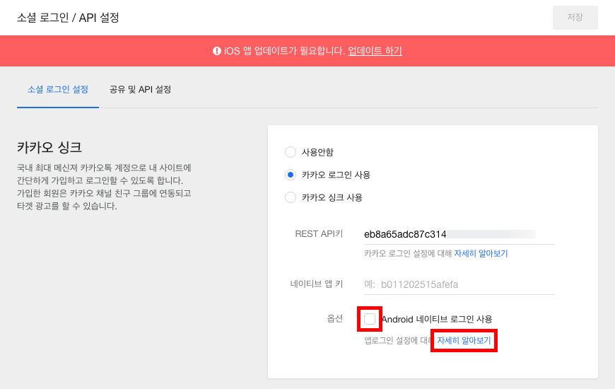 자세히 알아보기를 클릭해 앱 로그인 설정을 완료합니다. (아래 예시 그림은 카카오 앱 로그인 설정 화면입니다.)