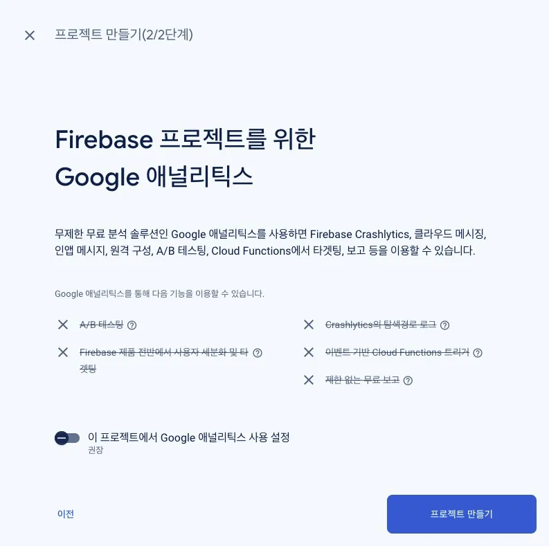 Firebase 프로젝트를 위한 Google 애널리틱스 설정 화면이 나오면, 이 프로젝트에서 Google 애널리틱스 사용 설정을 끄고, 프로젝트 만들기 버튼을 클릭합니다.