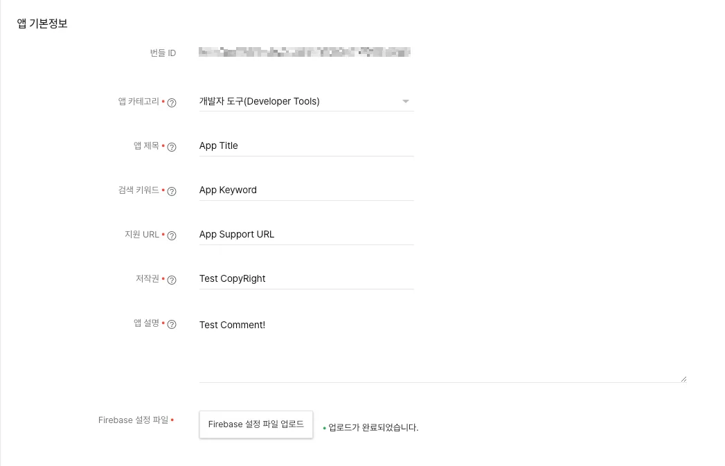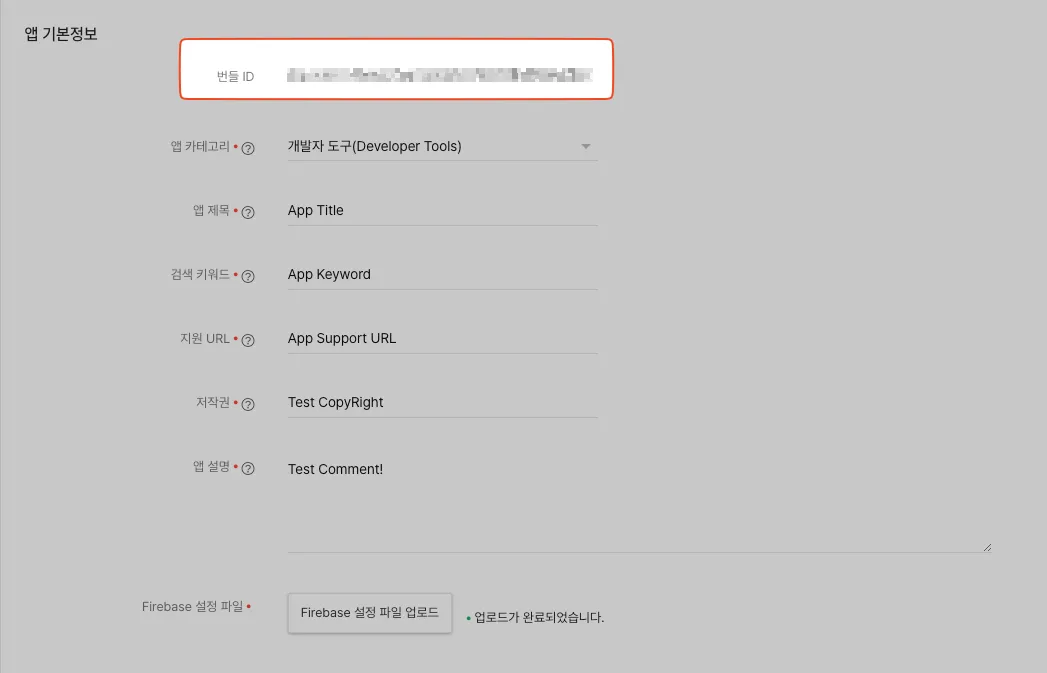 Apple 번들 ID에 위 2단계에서 복사한 번들ID를 입력하고, 앱 등록 버튼을 클릭합니다.