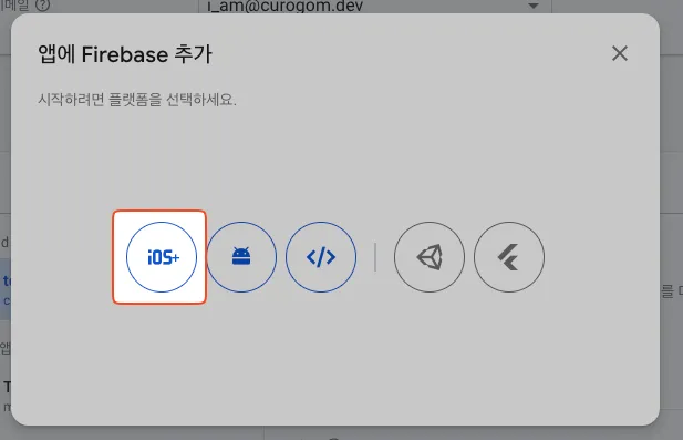 왼쪽 메뉴에서 [프로젝트 개요 > 1단계에서 생성한 프로젝트명]을 클릭하고, iOS 아이콘을 클릭합니다.