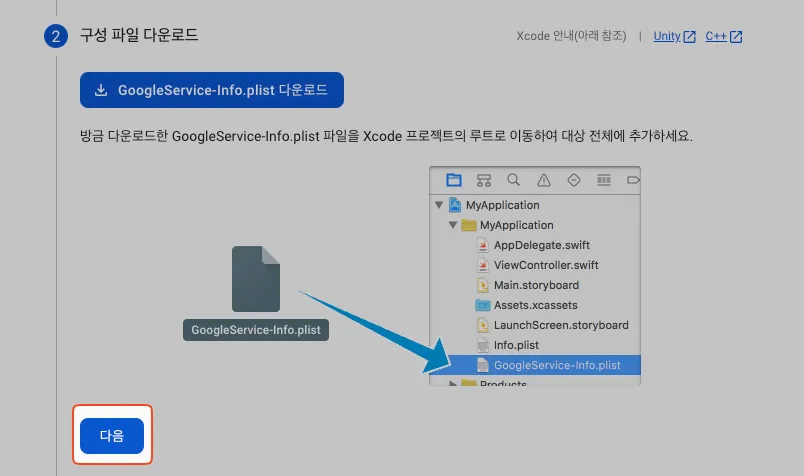 google-services-info.plist 다운로드 버튼을 클릭하여 google-services-info.plist 파일을 내 PC에 내려받고, 다음버튼을 클릭합니다.