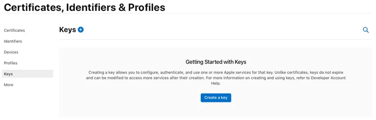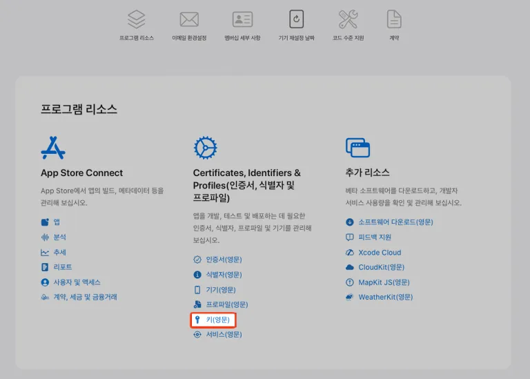 [프로그램 리소스 → Certificates, Identifiers & Profiles → 키]를 클릭합니다.