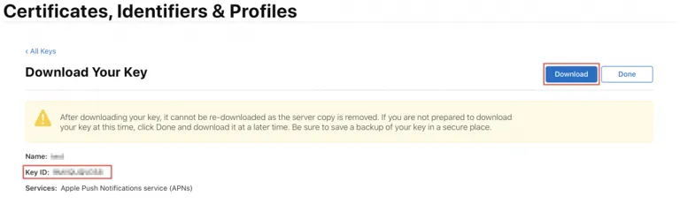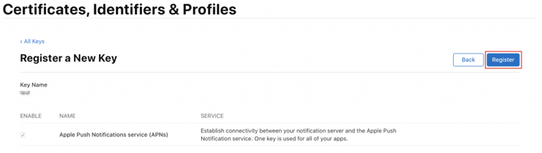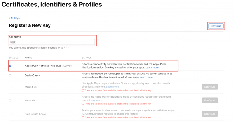 Key Name을 입력하고, Apple Push Notifications service (APNs)를 활성화합니다.