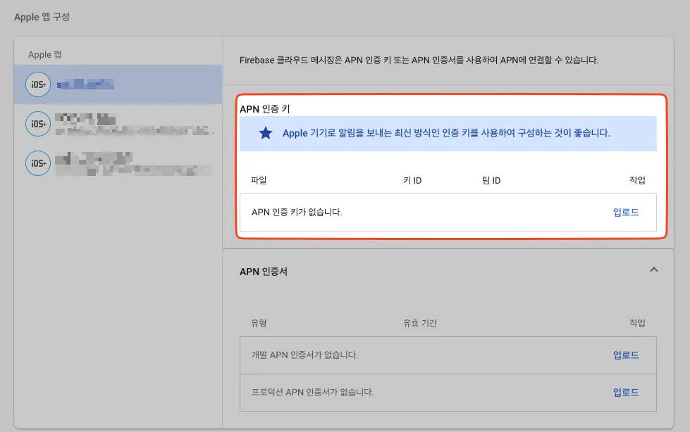 [Firebase 콘솔]에 접속하여 [좌측 패널 톱니바퀴 > 프로젝트 설정 > 클라우드 메시징 > Apple 앱 구성] 에서 나의 Apple 앱을 선택하여 다운로드 받은 APN 파일을 업로드합니다.