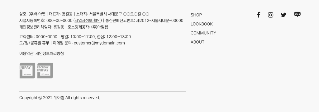 사업자 정보는 사업자등록증 상에 표기된 내용과 완전히 일치해야 하며, 쇼핑몰 하단/푸터에도 동일한 내용이 작성되어 있어야 합니다.