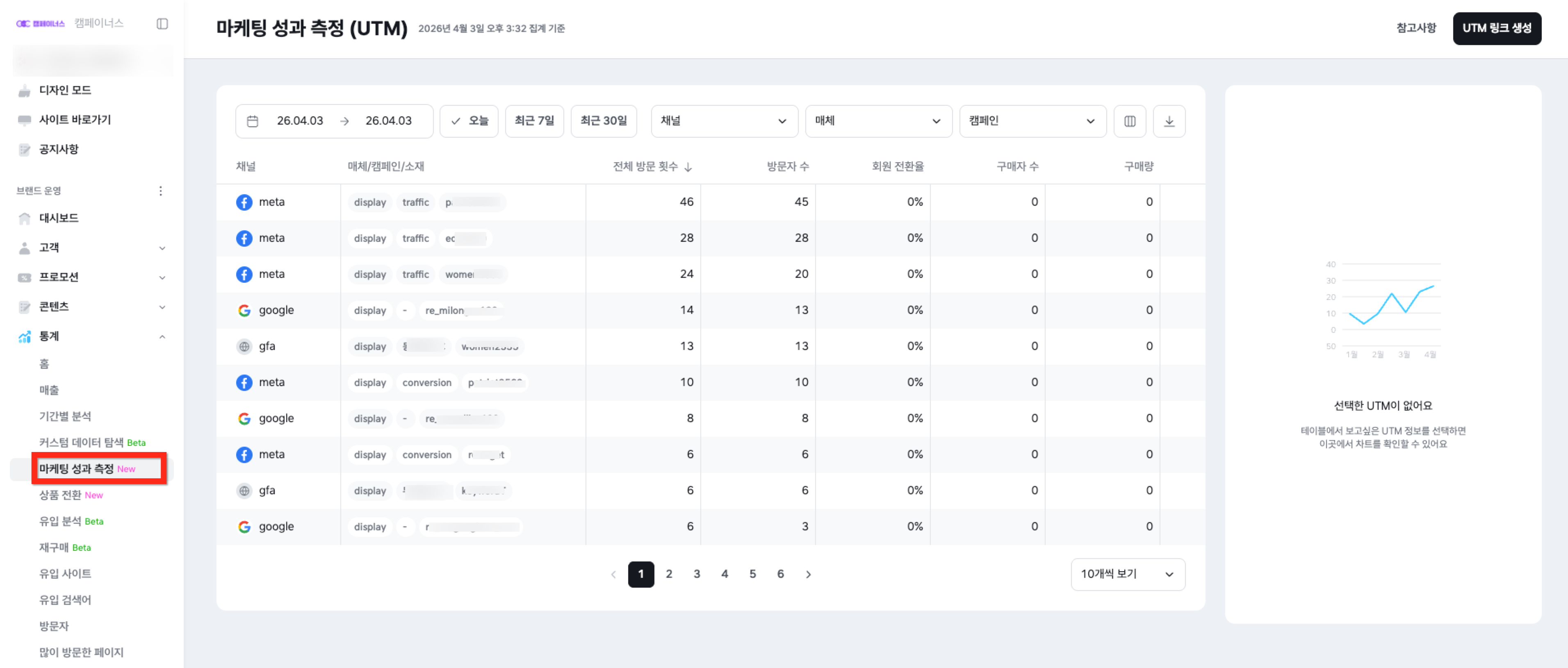 [마케팅 성과 측정(UTM)] 기능에서는 광고 및 마케팅 성과 측정을 위한 다양한 지표들을 제공해요.