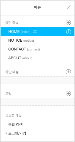 메뉴 관리에서 웹사이트 제작에 필요한 모든 메뉴(페이지)를 추가하거나 삭제, 설정할 수 있습니다.