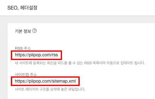 3. 내 사이트의 RSS 주소와 사이트맵을 마우스로 드래그하여 복사합니다. 복사한 주소는 메모장에 보관해 주세요.