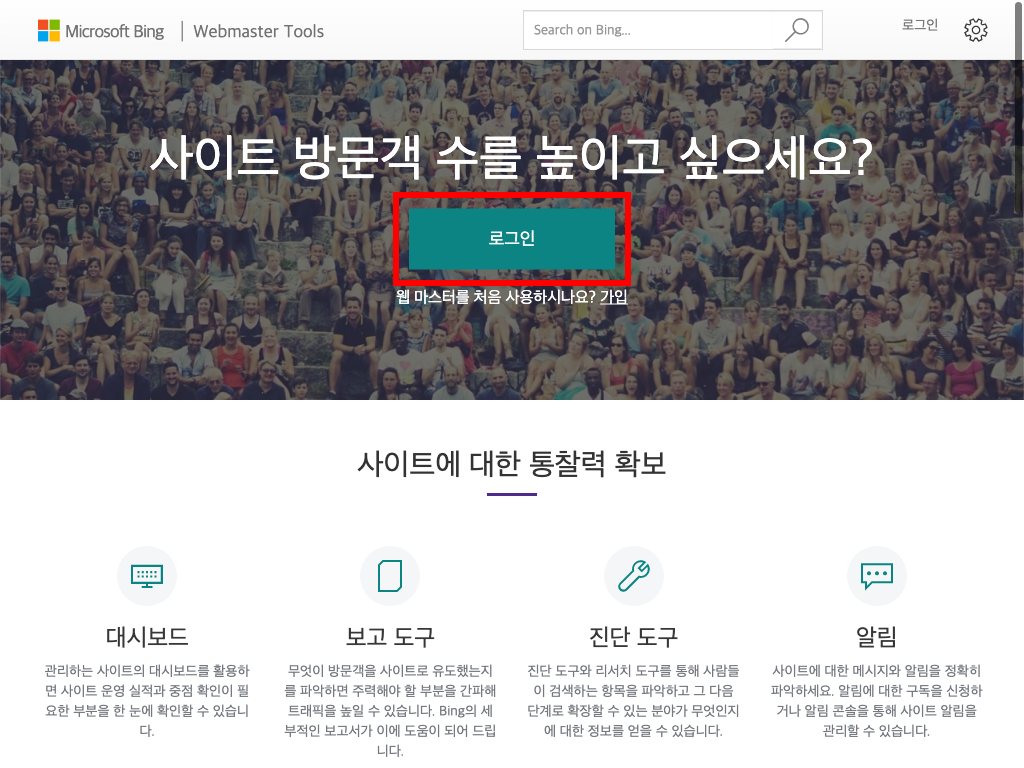 참고: Bing 웹 마스터 도구 계정이 없는 경우, 로그인 버튼 아래 가입을 클릭해 새로운 계정을 생성합니다.