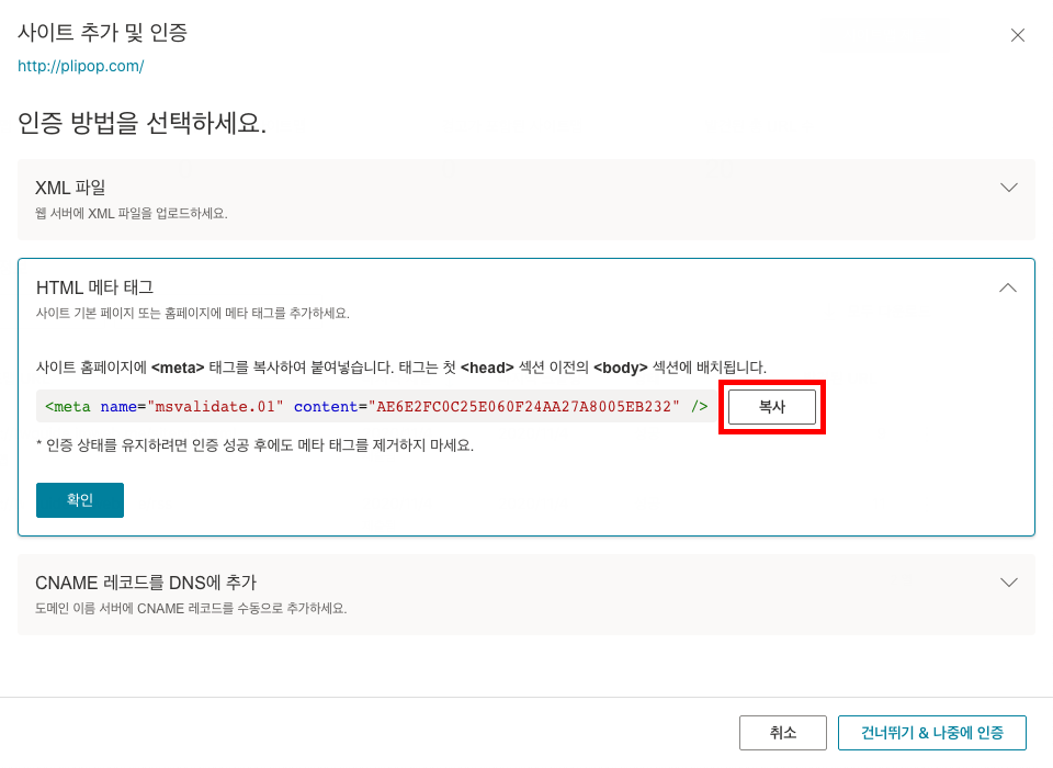 6. 복사 버튼을 클릭해 HTML 메타 태그를 복사합니다.
