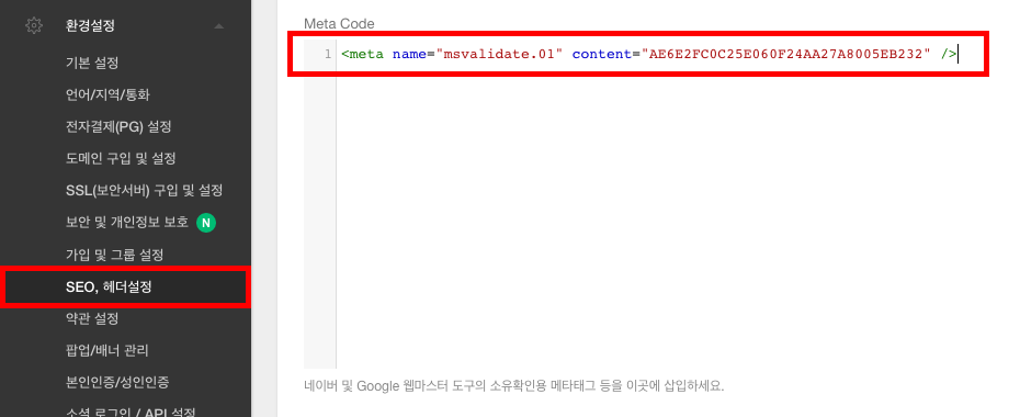 8. 왼쪽 메뉴에서 [환경설정 > SEO, 헤더설정]을 클릭해 이동합니다.