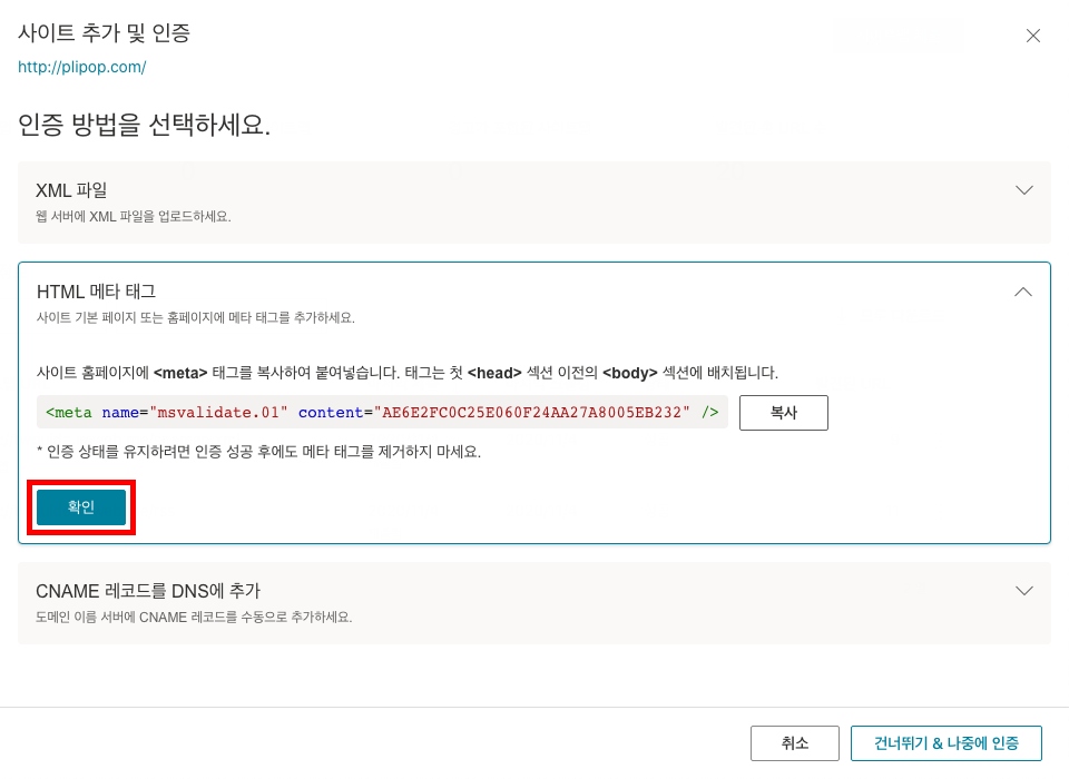 5. 사이트 인증 방법으로 HTML 메타 태그를 선택합니다.