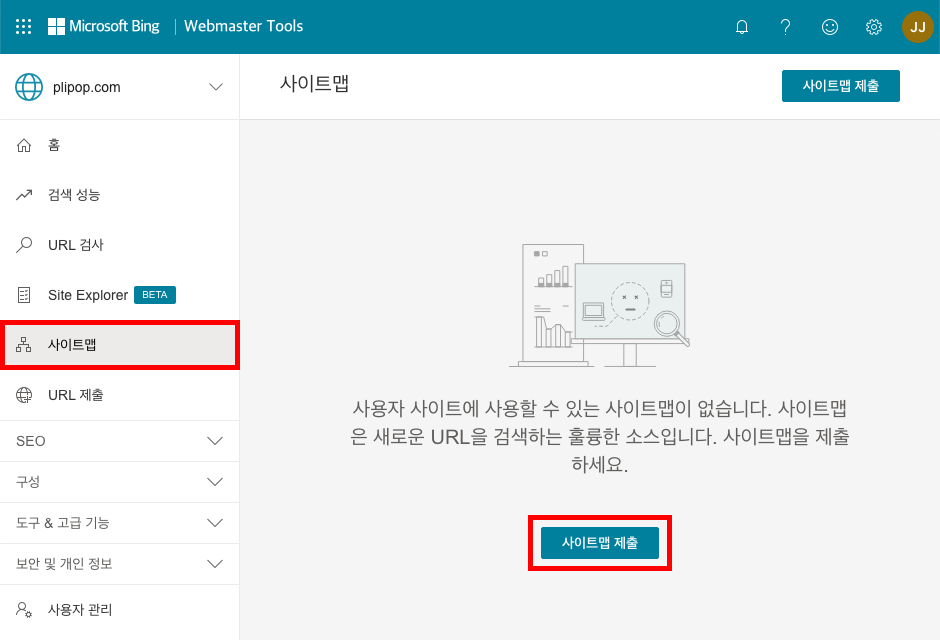 1. Bing 웹 마스터 도구의 왼쪽 메뉴에서 사이트맵을 클릭합니다.