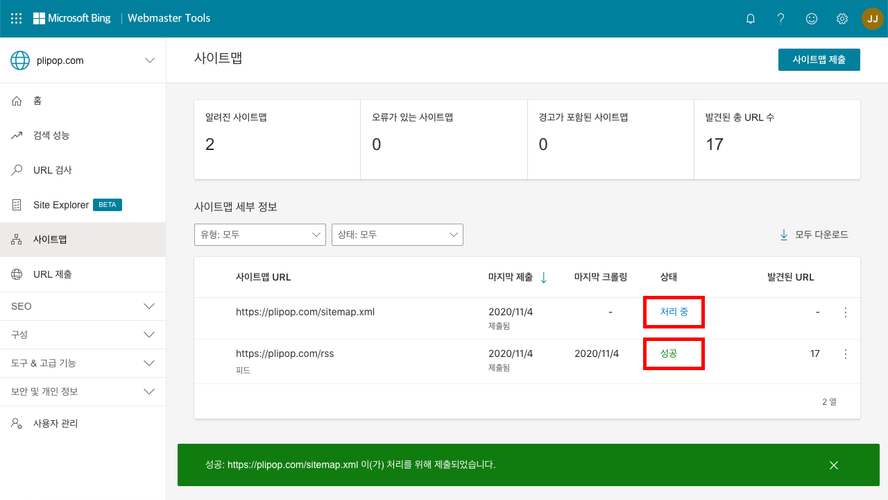 6. RSS 주소 및 사이트맵 처리 상태가 성공인지 확인합니다. 웹사이트 설정 상태 및 인터넷 환경 설정에 따라 약간의 시간이 걸릴 수 있습니다.