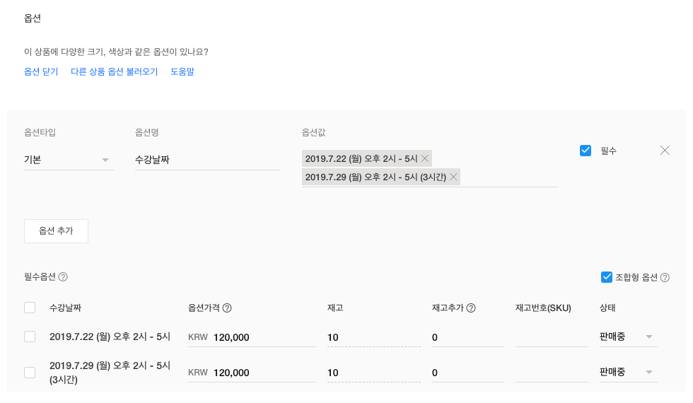 필수 옵션: 위 옵션값을 추가하면 필수 옵션 항목에 옵션이 추가됩니다. 가격을 입력하고, 필요한 경우 재고추가 항목에 숫자(인원수)를 입력합니다.