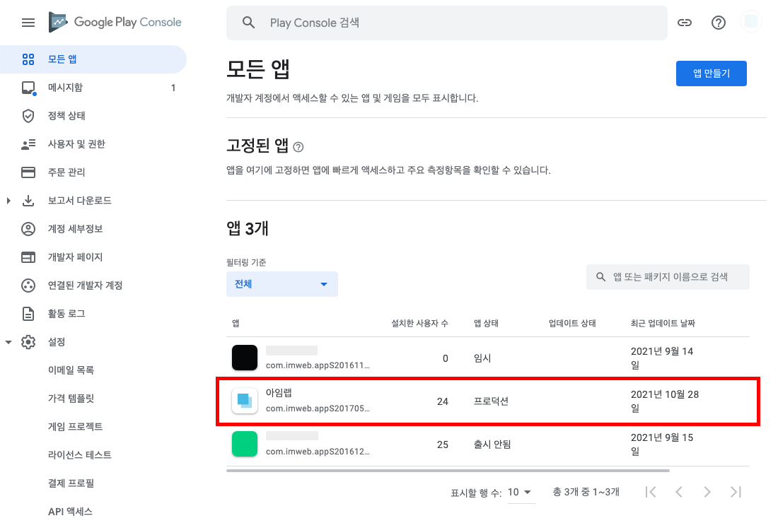 모든 앱에서 수정하려는 앱을 클릭합니다. (등록한 앱에 따라 1개만 있거나 여러 개일 수 있습니다.)