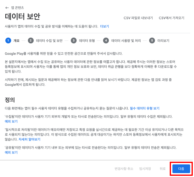 앱에서 회원가입을 받거나 상품 판매 등으로 개인정보를 수집하는 경우, 아래와 같이 세 개의 질문에 모두 예 를 선택하고 다음 버튼을 클릭합니다.