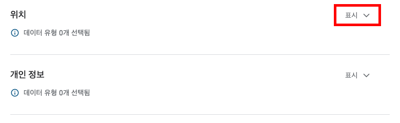 데이터 유형별로 오른쪽에 위치한 표시 를 클릭해 상세 항목을 열어 볼 수 있습니다.